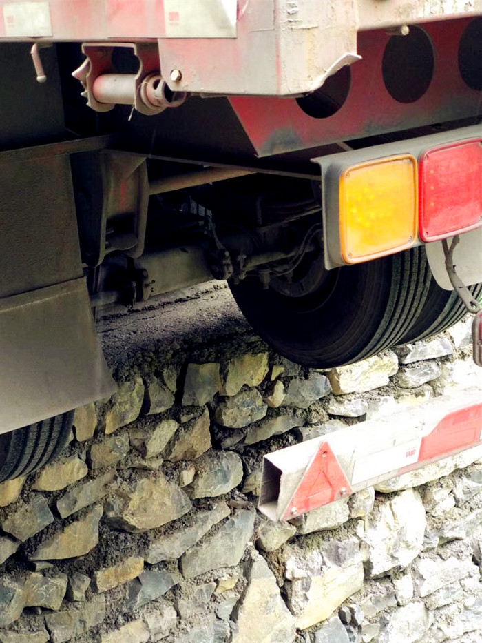 可以看到有车轮几乎悬空,轮胎上沾染着泥泞污渍,轮胎下是斑驳的石头强,很令人担心它会从此滑落下去。
