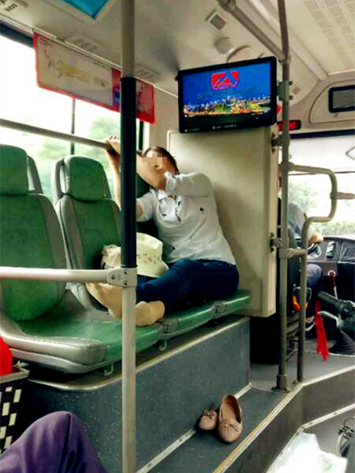 “她这样坐,都没有人愿意再坐过去,都是绕着走,这样的人太没有素质了吧”目击市民说,“她这样躺着,先不说她自己是否舒服,看着的人可能是不舒服的吧”