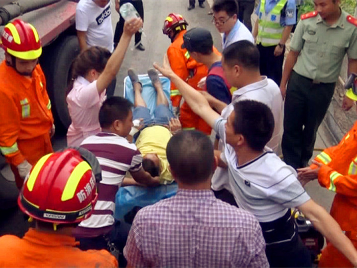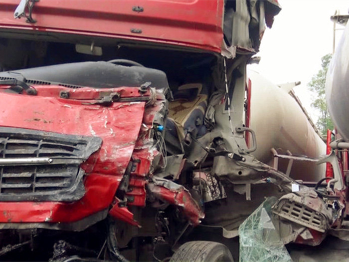两罐车相撞车头扭曲变形 一司机被困驾驶室