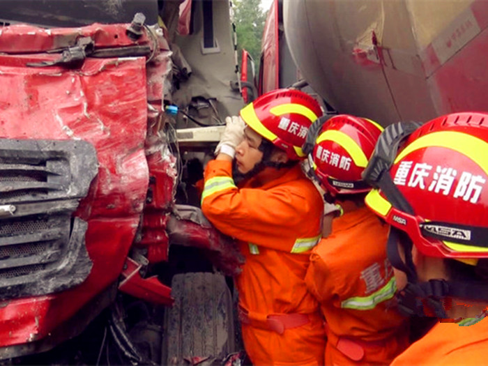 2018看6月15日,重庆垫江沙坪镇往梁平方向,在一处转弯道路两辆罐车会车时相撞,一名司机被困驾驶室。