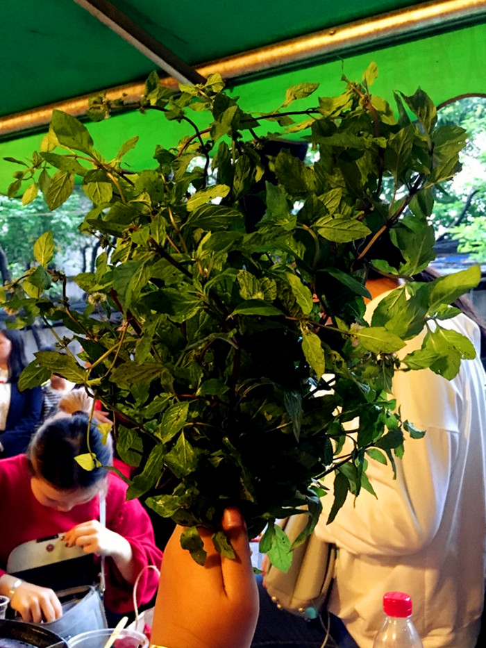 果然,市民这桌一直没人反应,老太就站在餐桌旁等着,等着大家掏钱,因为桌上没有人准备零钱,就直接给了一张5元钱,老太直接给了一把薄荷转身就走掉了。