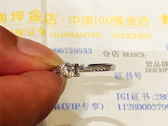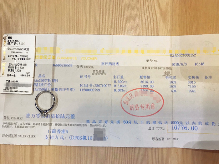 “这个戒指是6月3日买的,价格10000元多,平时就上班带着耍,现在却出现这样的问题,真的是不敢恭维”市民如实说道。