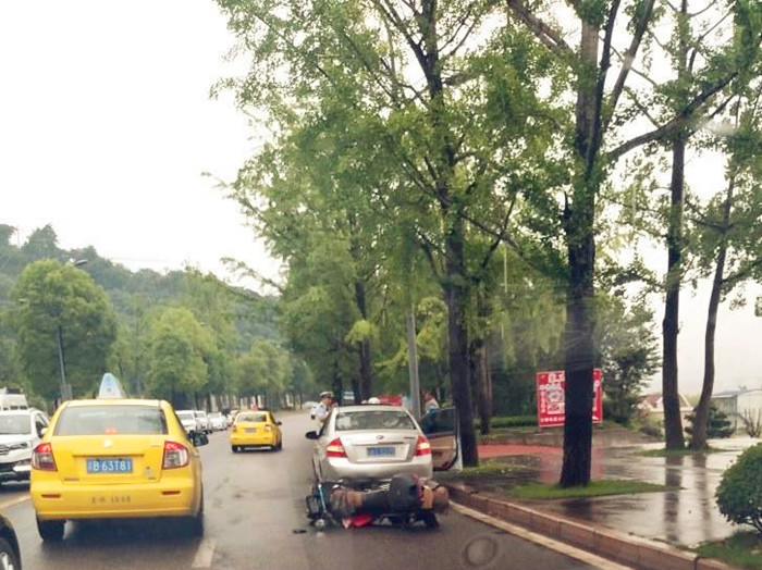 当时是早高峰,有不少出租车、私家车从这里经过,道路表面有些湿滑细雨朦朦。在事故现场有摩托侧翻在地,有些车身碎片残骸散落在了地面。