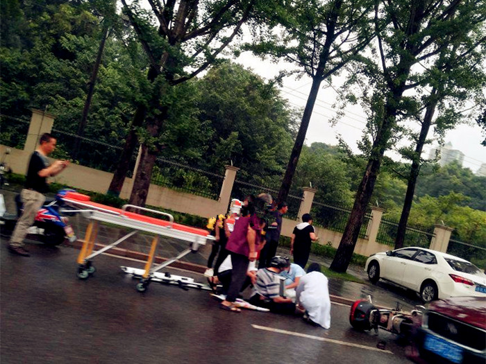受伤摩托司机的意识还算清醒,在对他进行了初步的处理后,被抬上担架送医治疗。