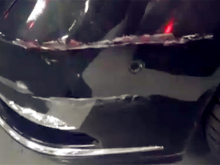 于是,大家又回到车库现场,对两车车身重新进行了检查,在红色车右后轮附近及车身上,先后发现了不太明显的刮痕。