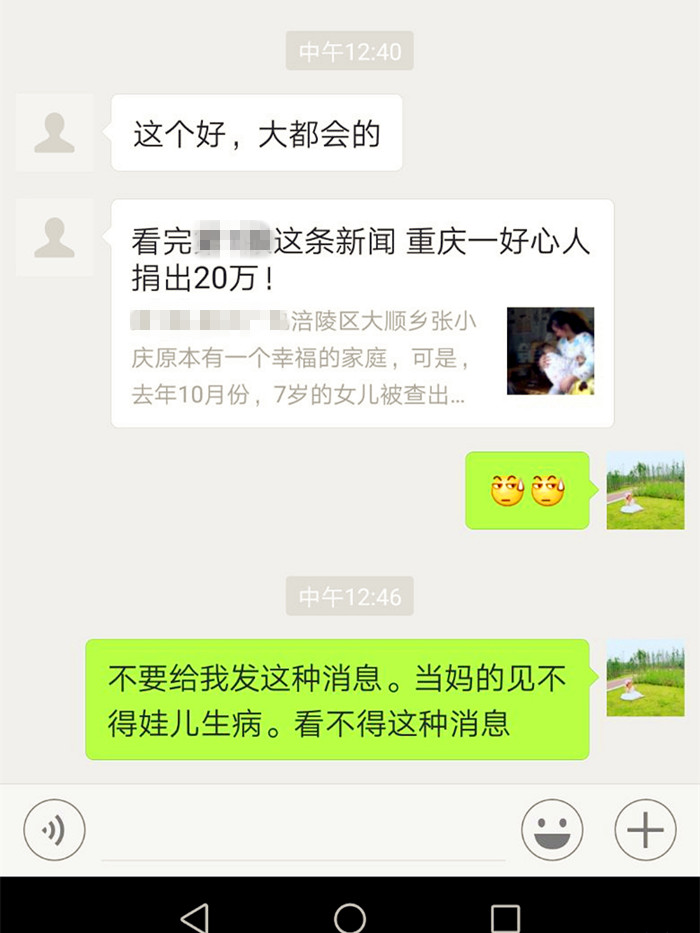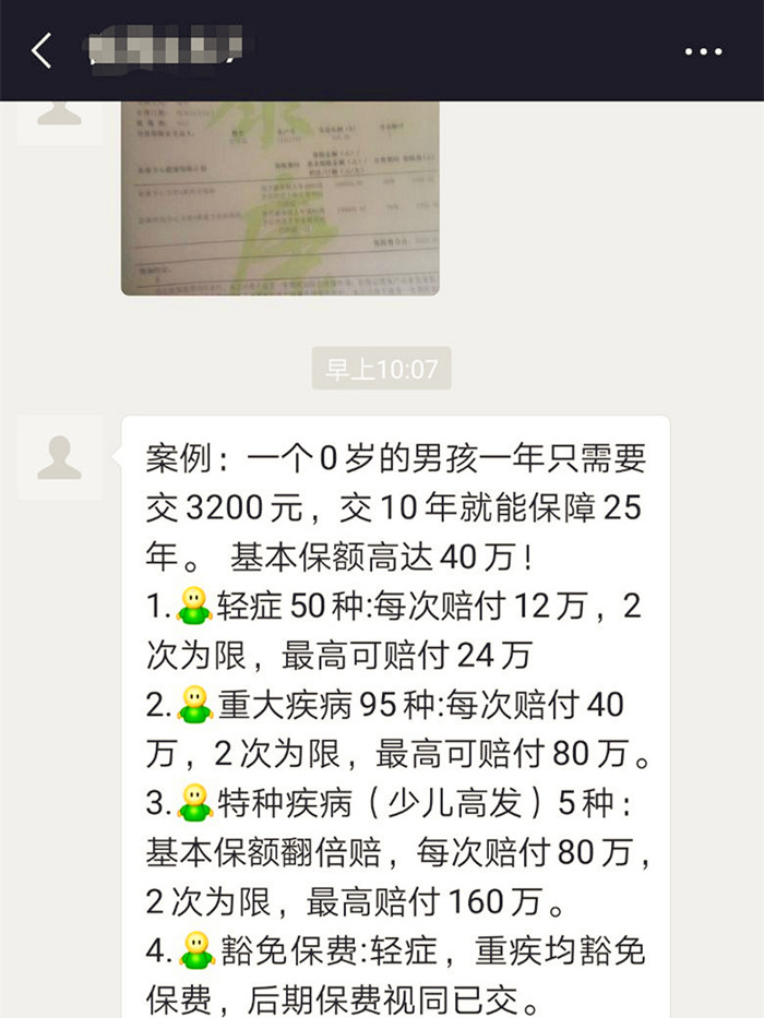 今早起来,看到手机上邻居发来消息,是在推荐0岁宝宝的重疾相关的保险,然后陈女士看了没回消息。那知道2小时后,邻居发了条孩子生病后,不得不众筹的新闻过来,让陈女士彻底气炸了。