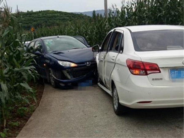 蓝色私家车侧着身子,部分车身被挤出路面,栽进玉米地,引擎盖拱起,车头受损严重。