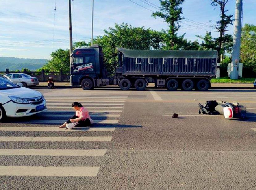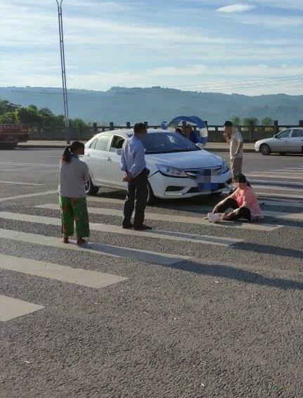 女子骑车与轿车相撞 瘫坐在斑马线上