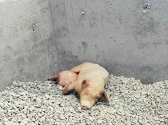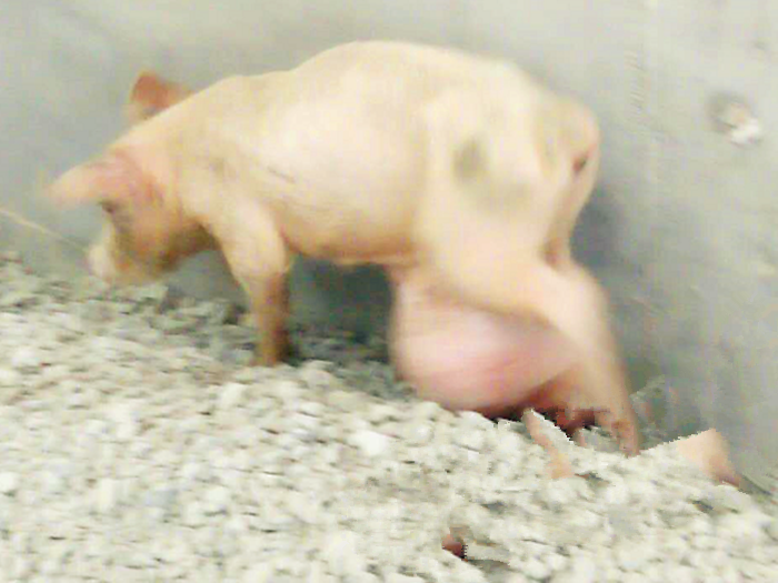 大家并不是担心它跑来要吃的,而是因为这头流浪猪的肚子下面挂着一个肉瘤,十分巨大。
