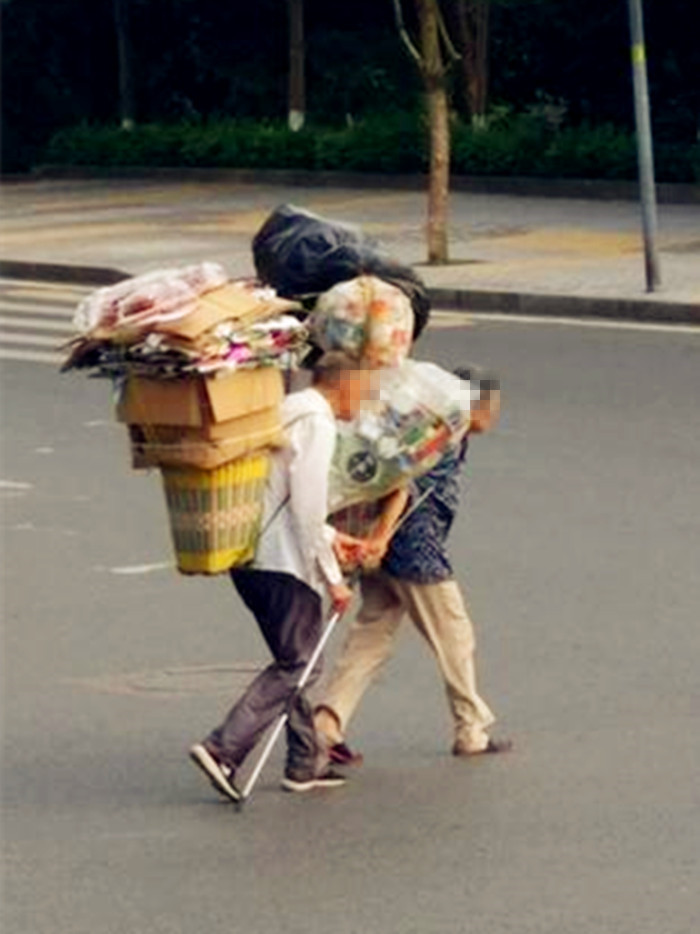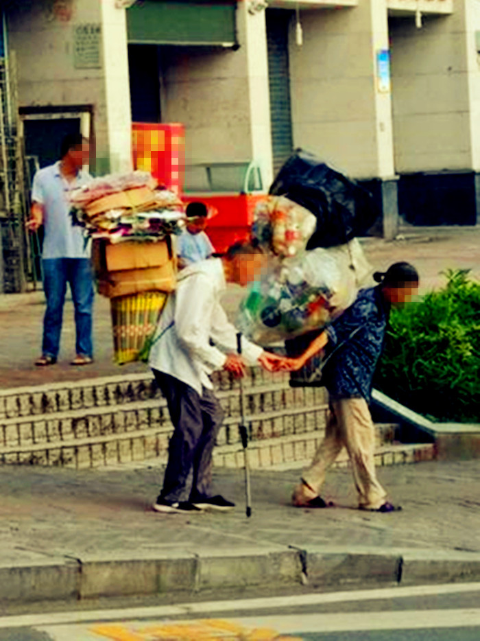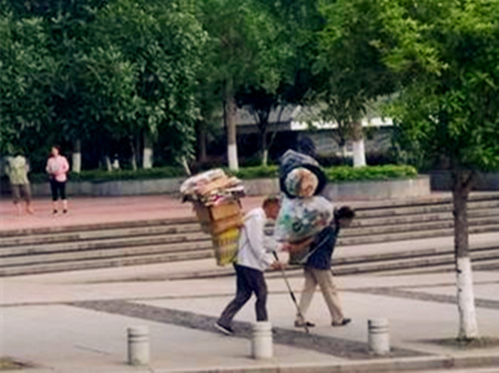 老夫妻背满废品 相互搀扶一路相伴