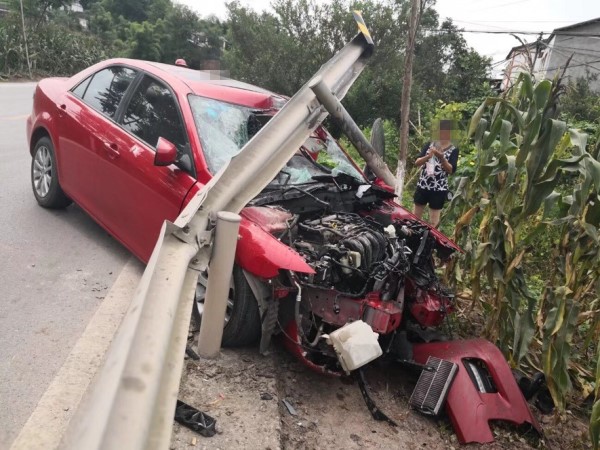 这辆红色私家车侧着身子,车头停靠在公路边缘下方,而车尾则停靠在路边。车头已经分不出轮廓,内部零件都清晰可见并有所损坏,遭遇碰撞后的划痕满车皆是,车身铁皮散落一地。