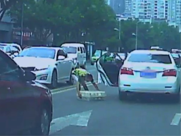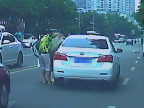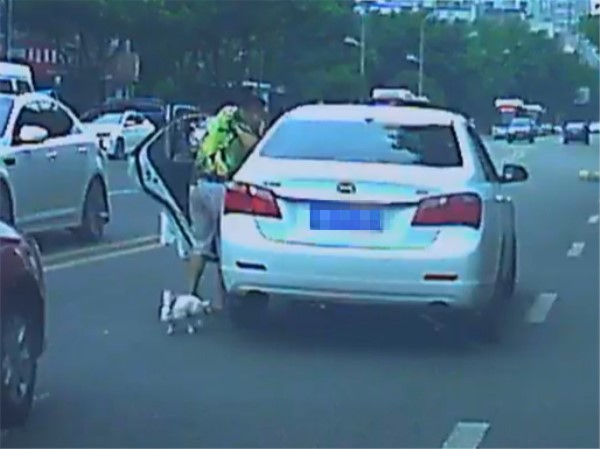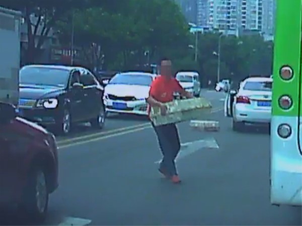 通过行车记录仪可以看到,一位身穿红色短袖的男子,抱着一筐活兔,穿过许多车辆,将其送至路边,以防箱子影响道路通行。