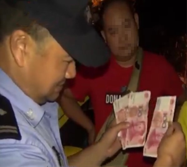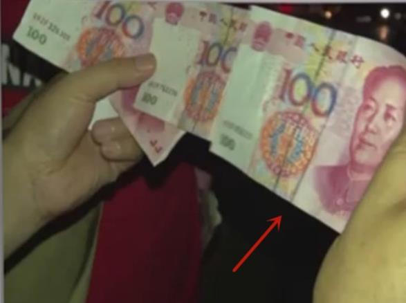 这张100元的“假钱”两人都不承认是自己的,民警只好让身边的路人验证一下,是否真的是假钱。