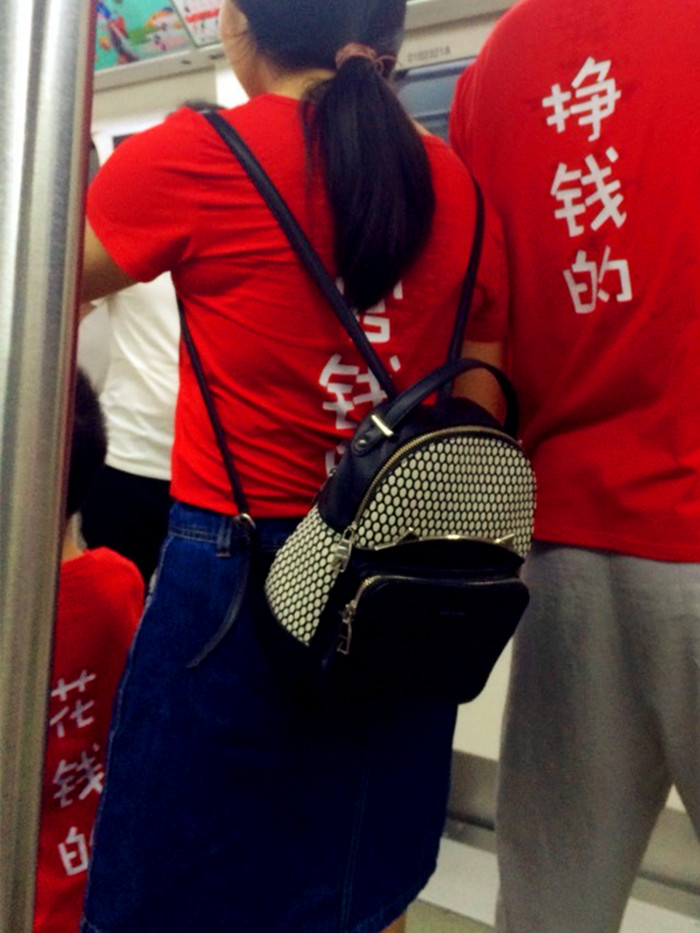 只见爸爸、妈妈、儿子三人的上身都穿着红色的短袖T恤,儿子的背上写着“花钱的”,妈妈的背上写着“管钱的”,爸爸的背上写着“挣钱的”,三人依次站在车厢扶杆附近。