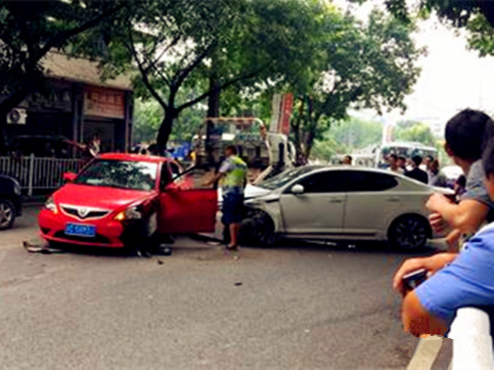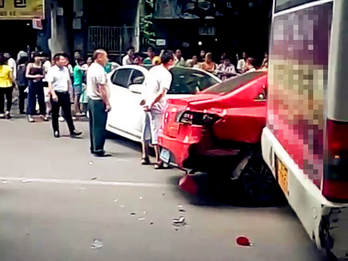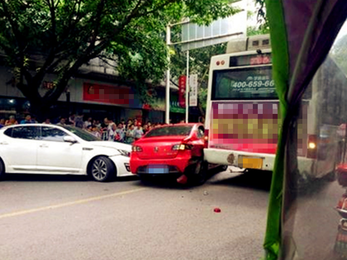 2小车1公交当街相撞 现场惨烈引围观