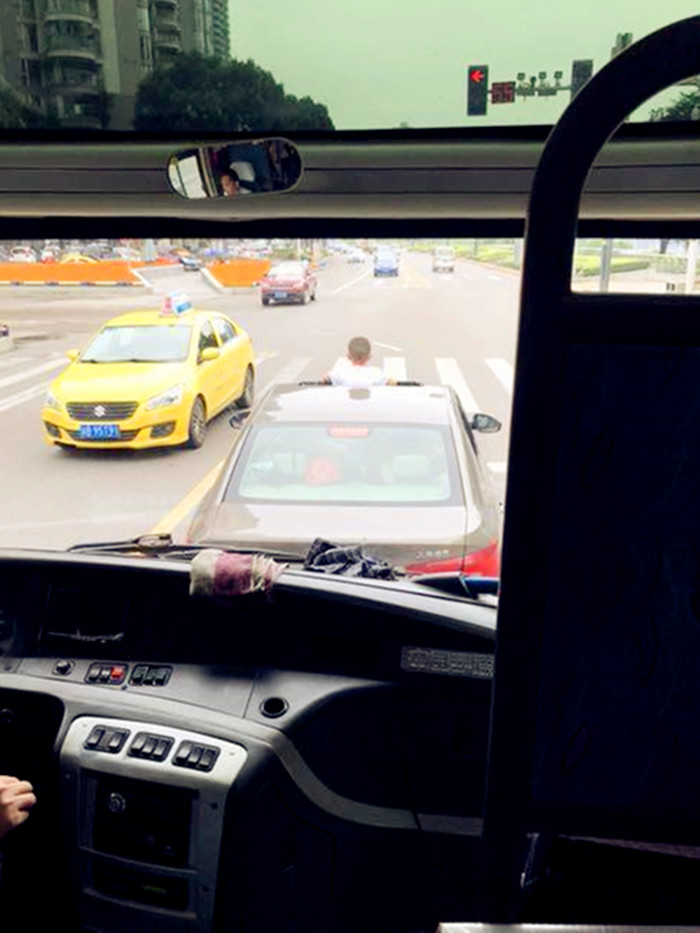 发布时间:2018-07-08 13:13:582018年7月7日,重庆江北。有市民乘坐大巴出行,大巴车行驶至金源路附近一个红绿灯路口时,看到就在大巴车前方,一名男童站在一辆私家车上,半个身子从天窗里探了出来。