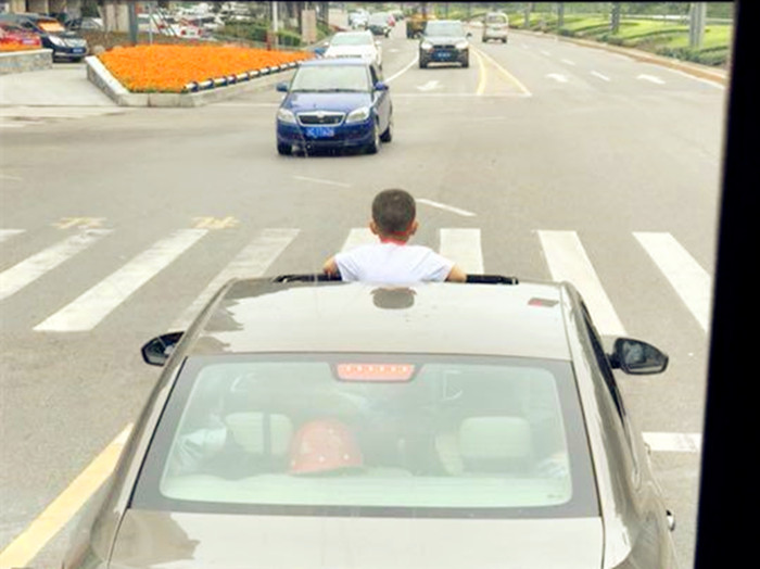 男童半个身子从车内探出 看得后车乘客胆战心惊