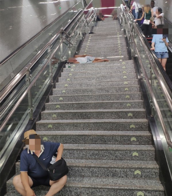 轨交站扶梯处变“纳凉亭” 大爷打地铺睡觉