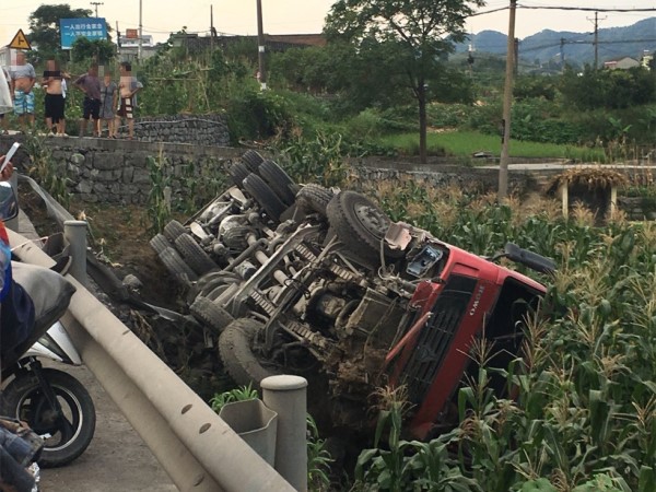 从爆料网友提供的图片来看:公路右侧的护栏受损,而这辆红色的大货车侧着身子停靠在玉米地里。事故导致这辆货车的车头受损严重,车子的前侧部分出现了断裂,车身变得有些扭曲,上面吸附着大量的泥土,车身铁皮零件散落一地。