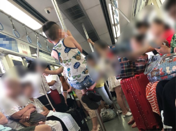 车厢内也有其他的乘客,向男孩投去异样的的眼光,但男孩却不理会,继续往上爬。
