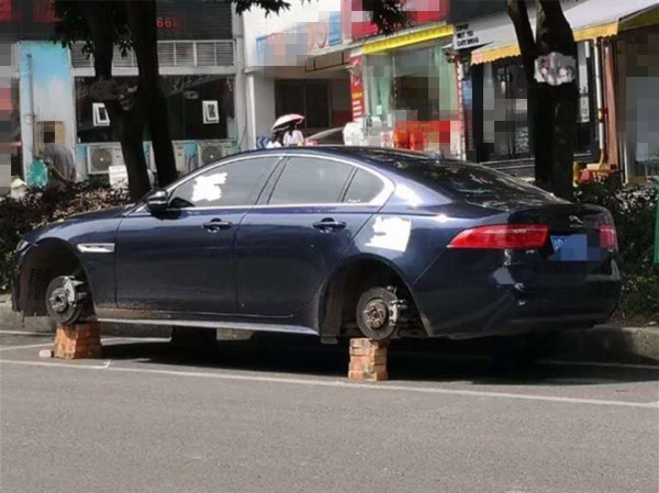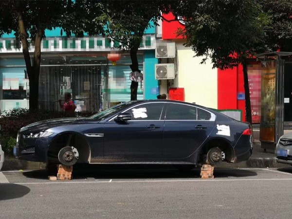 轿车停路边 三个轮胎变成了“砖块”