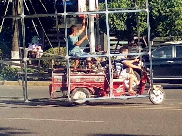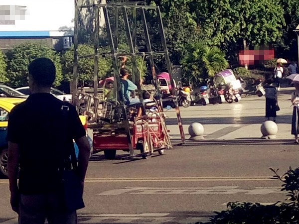 有路人看后,认为:“这样的三轮车超高又超重,真为后座的男子捏一把汗,一旦发生什么不测,后果不堪设想”。