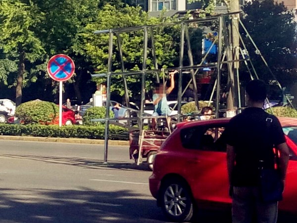 最引人注目的是,被绳子绑在三轮车上的货架,看上去差不多有三米高,男子和三轮车司机被两边的货架夹在中间。