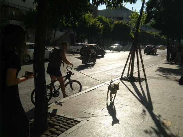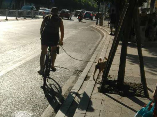 “我也是第一次看到这样的遛狗方式,当时正准备过人行道,看见这名男子骑着自行车一直走,狗仔保持同样的速度跟上他,相互配合很有默契。”,李女士说道。