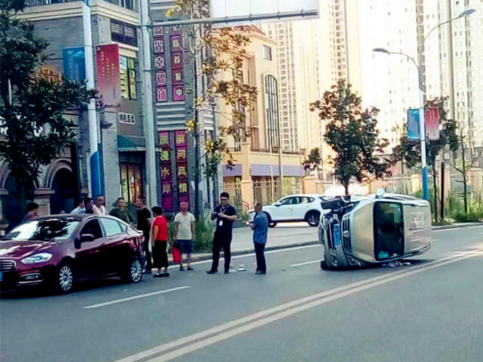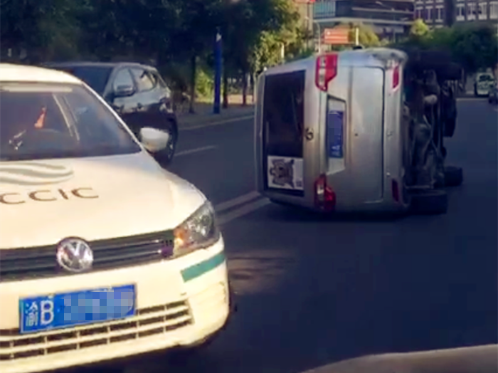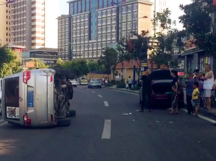 面包车“怼”上轿车弹开 侧翻在路上