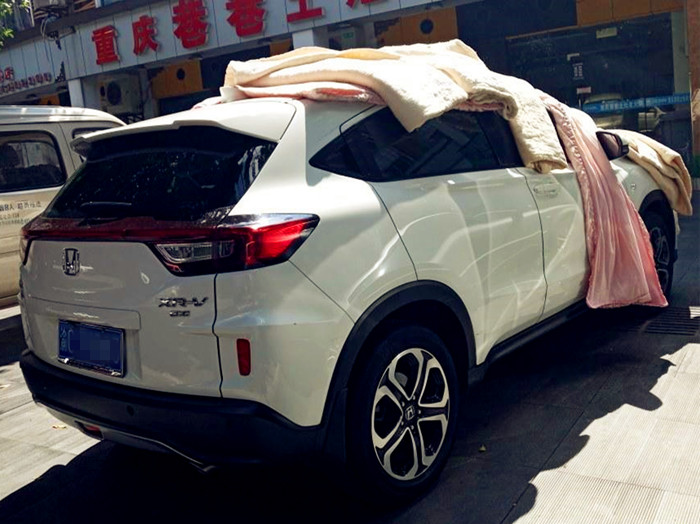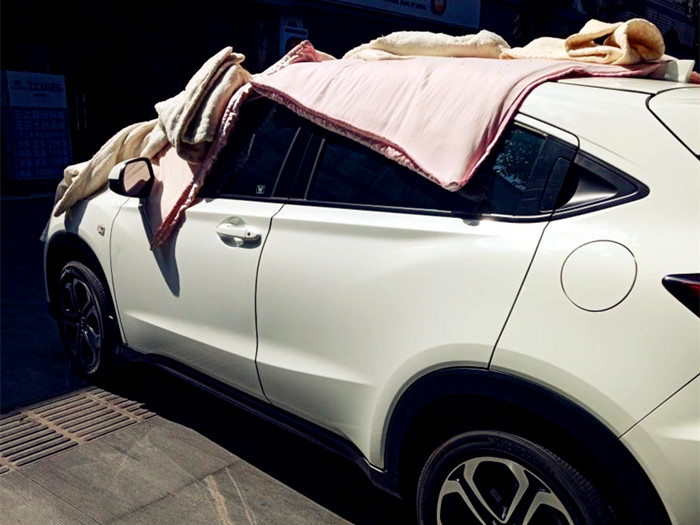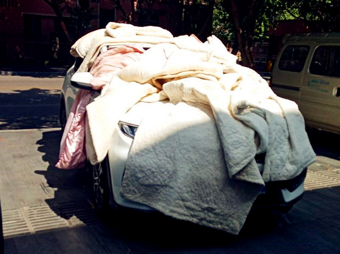 可以看到这辆白色的自家车上,不止被铺盖上了棉絮被芯,还被铺盖上了床垫,车头、车顶被盖了个扎实,视觉效果非常震撼。