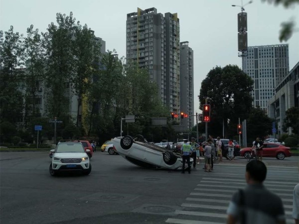 尴尬!白色小车“四脚朝天”躺在路上