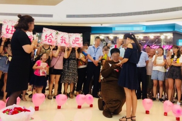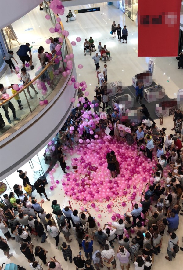 发布时间:2018-07-29 12:41:482018年7月28日,重庆綦江。一男子在商场内布置了场求婚,用戒指盒带着粉色气球拼成了一个心型,画面温馨浪漫。