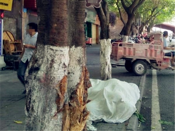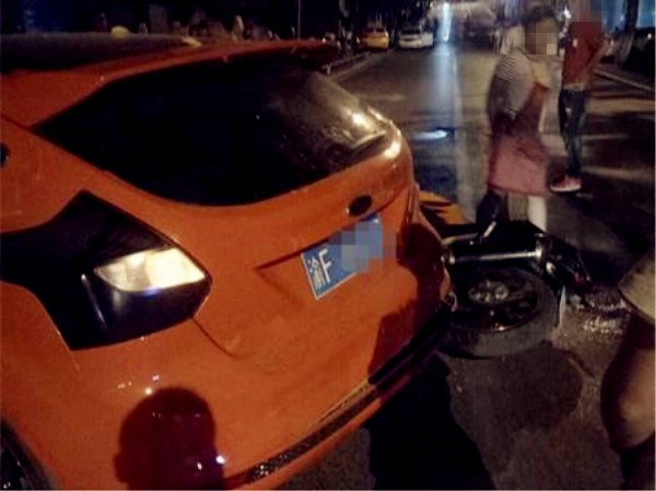据爆料网友提供的图片来看:这辆橙色的小车直撞大树,导致树皮脱落,便横向停靠在路边,而摩托车侧着身子躺在小车车尾处。