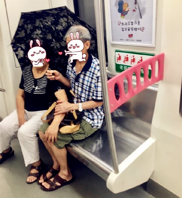 从爆料网友拍摄的图片来看:车厢内坐着一对老人,两人亲密的靠在一起。这位70岁左右的爷爷,头发花白,右手撑着黑色打底的花伞,为老伴挡风,左手放在老伴手臂上,给她带来一丝温暖,膝盖上放着老伴的背包。