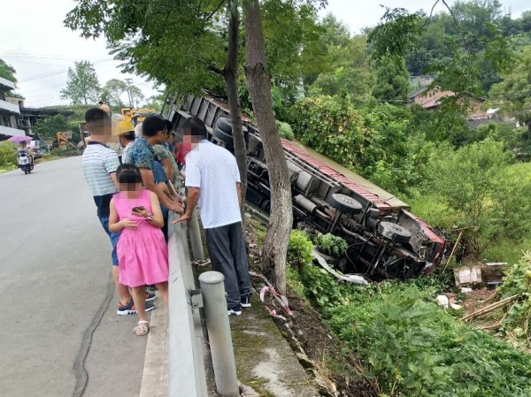 发布时间:2018-07-31 16:44:382018年7月31日,重庆长寿,有网友爆料,在天台寺附近,发生一起惊心动魄的交通事故,一辆红色大货车掉进路边的斜坡。
