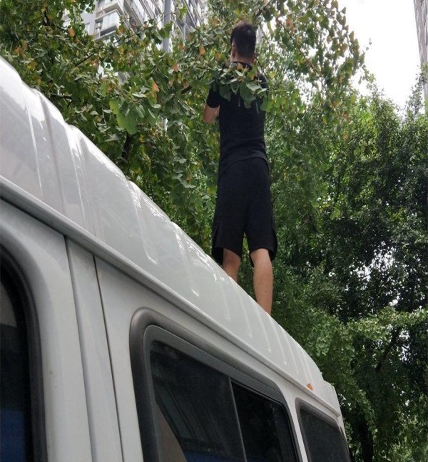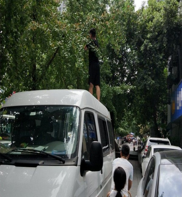 从爆料网友提供的图片来看:一位男子全身搭配深色系的服饰,站在一辆白色的面包车上,竟然毫无顾忌的摘果子。