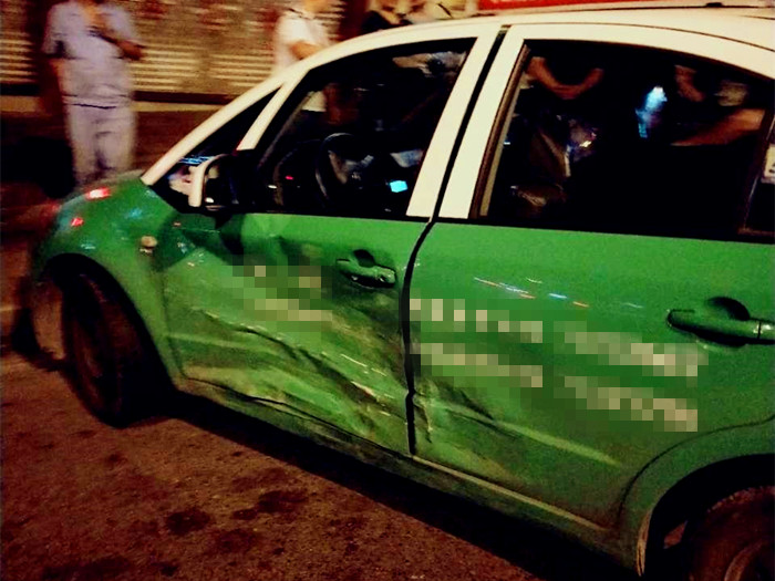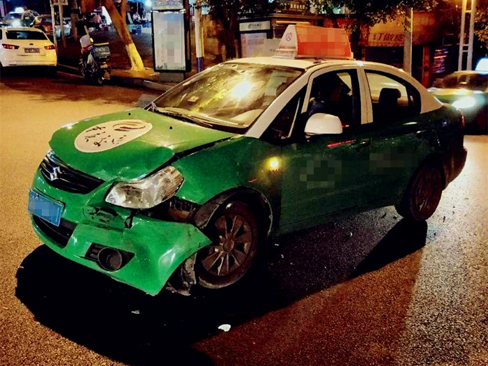 两辆出租车凌晨相撞 其中一车驾驶室车门被撞凹陷