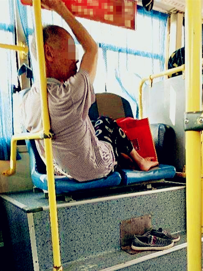 这位大爷一人占了两个座位,上身穿着一件带小方形花纹密布的短袖T恤,下身穿着一条带波纹的黑色九分短裤,随身提着一个布袋子。“他脱了鞋子光着脚,横坐在公交座椅上,右手拉着手环,左手扶着座位靠背,眼睛望着前方。”