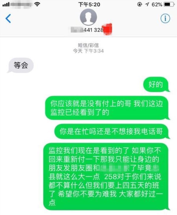 营业员给男子发信息,希望男子能将258元的费用补上,男子回了信息说“等会”。