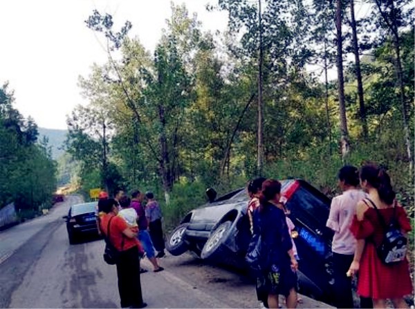 从现场图片来看:事发路段处于一条弯道附近,而这辆黑色小车,倾斜着身子 ,陷入沟里难以脱离困境。