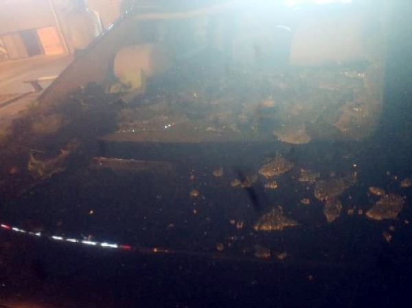从现场图片来看:花盆从天而降,砸中轿车,并滚落在地,而泥土四处飞溅,洒在这辆凯迪拉克挡风玻璃处,整个车头看上去脏兮兮的。