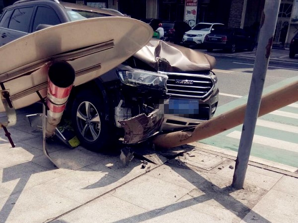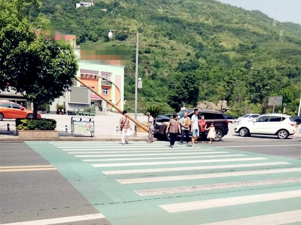 从爆料网友提供的图片来看:这辆轿车左右车轮不处于同一平面上,倾斜着身子,停靠在斑马线附近。只见这辆轿车的车头与灯杆亲密接触,导致灯杆弯曲正好压在旁边的树枝上,地面的砖块已经裂开。