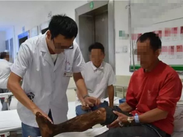 只见男子抬着右腿,让医生为他受伤的部位进行检查和处理。