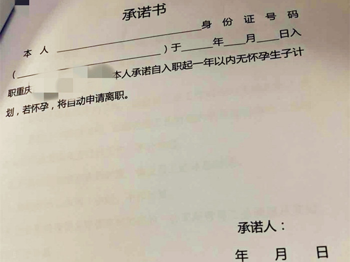 这纸承诺书写着“本人于X年X月X日入职重庆XXXX公司,本人承诺自入职起一年内无怀孕生子计划,若怀孕将自动申请离职。”,公司要求入职的女性均需要填写这纸承诺书。