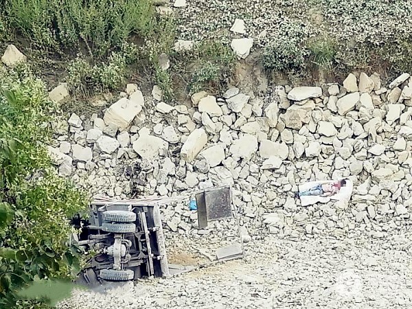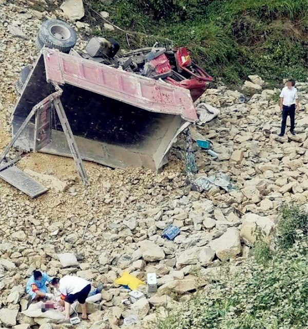 大货车不慎摔下坡 车身严重受损