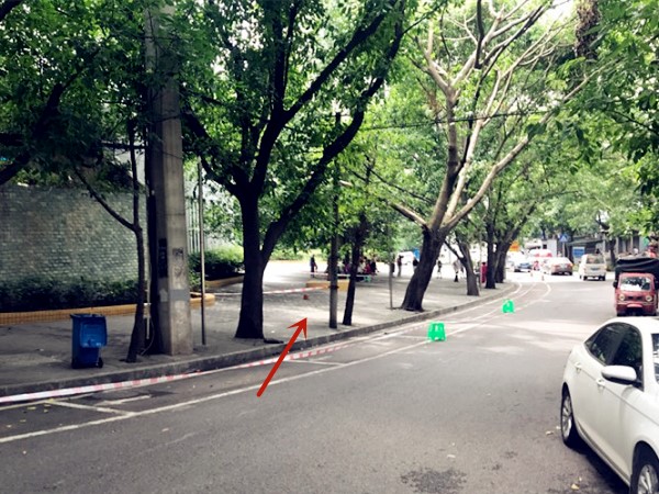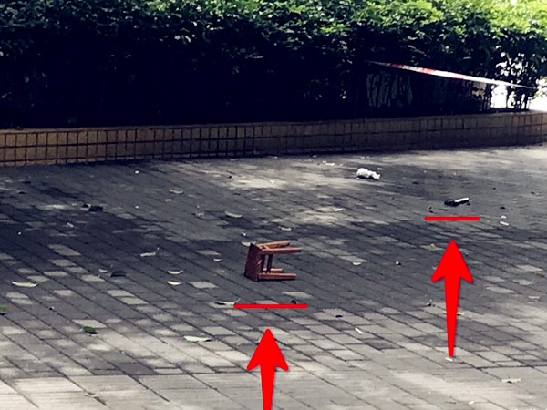 从目击市民拍摄的图片来看:现场已经拉起了警戒线。在地面上有一根木凳,离它不远处还有一把榔头。