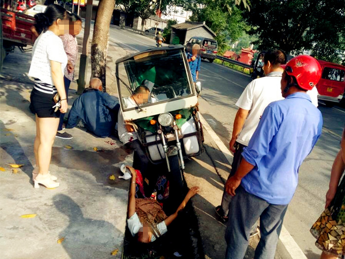 在事故现场,有黑衣大爷从三轮车上滚落在了三轮车右侧,跌坐在水泥地面上,白衣男子的下半身被卡在了三轮车与路沟沟璧之间,而那名女子背向下脸面朝天,反倒在了路沟底,女子正上方就是三轮车。