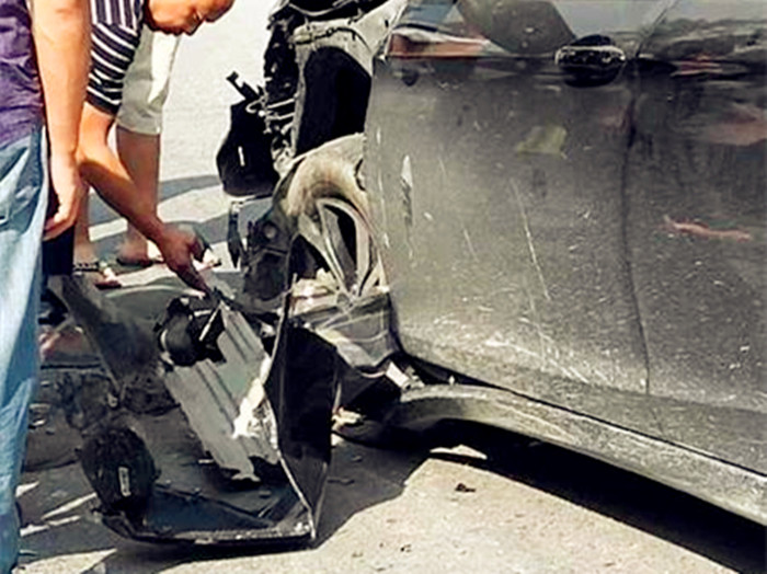 事故现场可以看到,黑色小车车头左侧撞上了货车,保险杠破损开裂,车身被撞凹陷,车身残片散落在地面上,左侧前车轮也破损严重,刮痕明显看着都让人心疼。