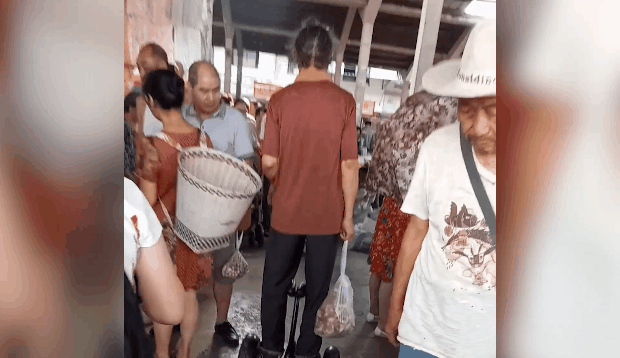 太潮!老人扎着丸子头踩着平行车逛农贸市场