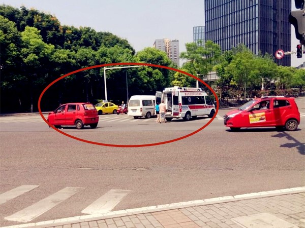 事发地处于一个十字路口,这辆红色三轮车停靠在路中央,而白色面包车正好停靠在斑马线处。